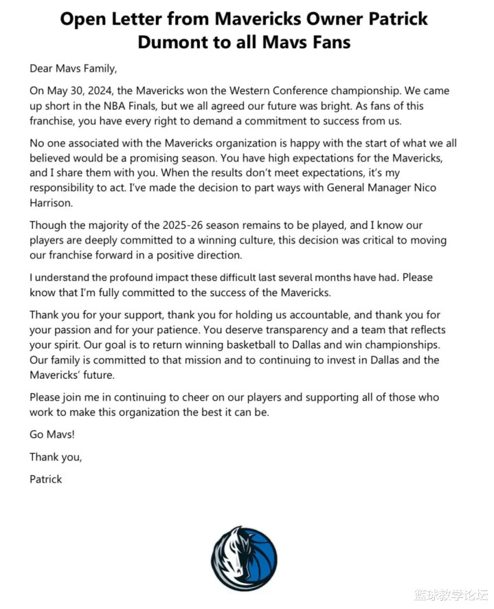 迈克尔-芬利和马特-里卡迪,成为独行侠临时总经理。截至教主发稿,独行侠3胜8负排名西部倒数第二,战绩仅好于2胜8负的鹈鹕。独行侠老板杜蒙特发表公开信:全队上下都无法接受这个糟糕的开局,我必须采取行动,解雇哈里森!