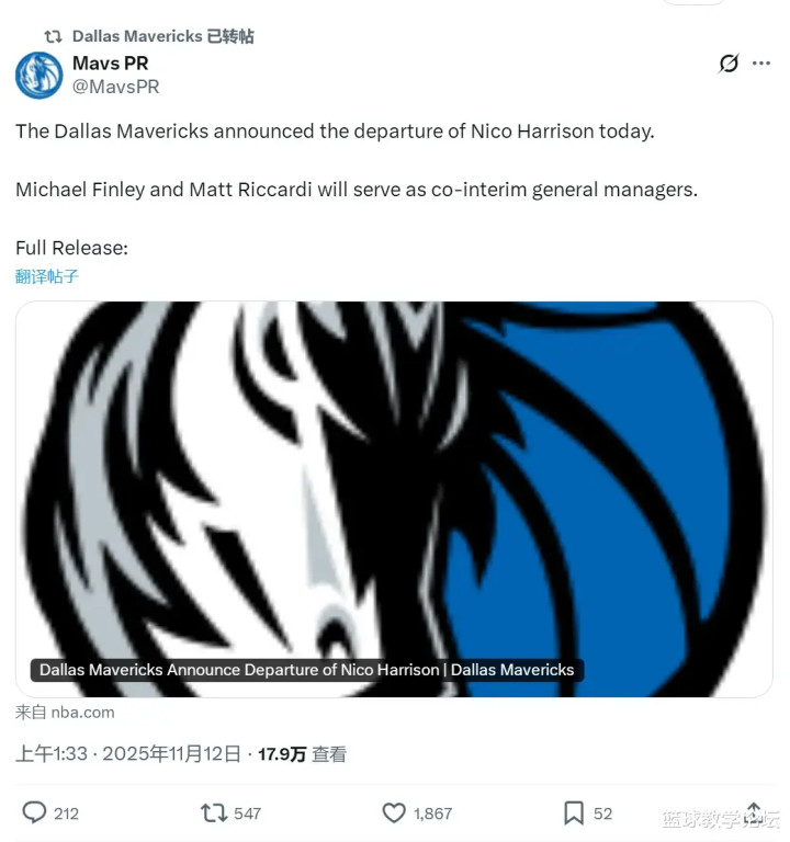 北京时间11月12日凌晨1点半,达拉斯独行侠官方宣布:正式解雇总经理尼克-哈里森,后者即日起离开球队。NBA名记Brett Siegel认为哈里森只是一个背锅侠:“如今解雇哈里森的人(独行侠老板杜蒙特),正是当初批准交易东契奇的人!”