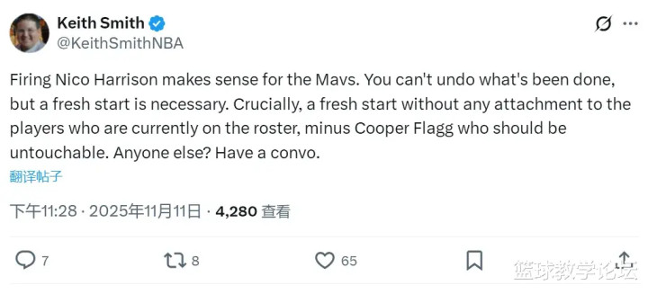 自从东契奇和浓眉的交易达成之后,湖人取得30胜16负,独行侠只有16胜28负。另一记者Keith Smith认为:“独行侠解雇哈里森是正确选择,他必须为独行侠的烂摊子负责。独行侠应该开启交易谈判,除了弗拉格,其他都能放上谈判桌。”