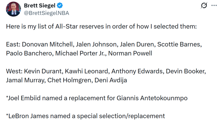 虎扑01月31日讯今日,知名记者BrettSiegel谈到了他选出的全明星替补阵容,按挑选顺序排列: